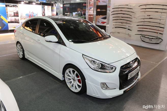 순백의 바디킷이 장착된 현대 엑센트가 스포티한 분위기를 자아낸다. 차체와 색을 맞춘 흰색 휠 안에는 붉게 도색된 캘리퍼가 눈에 띄고, 전면 라디에이터 그릴은 주변부까지 넓게 검은색으로 처리되어 있다.