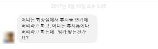 “화장실 휴지를 변기에 버리라는 데도 있고 휴지통에 버리라는 데도 있는데 뭐가 맞나요?”(16일 페이스북 메시지로 받은 취재 의뢰)