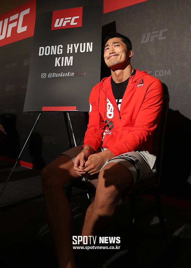 [스포티비뉴스=싱가포르, 곽혜미 기자] UFC 파이트 나이트 111(UFC in 싱가포르) 미디어 데이가 15일 오후 싱가포르 마리나 베이 샌즈 호텔에서 열렸다. 웰터급 김동현이 인터뷰를 하며 긴장을 풀고 있다.