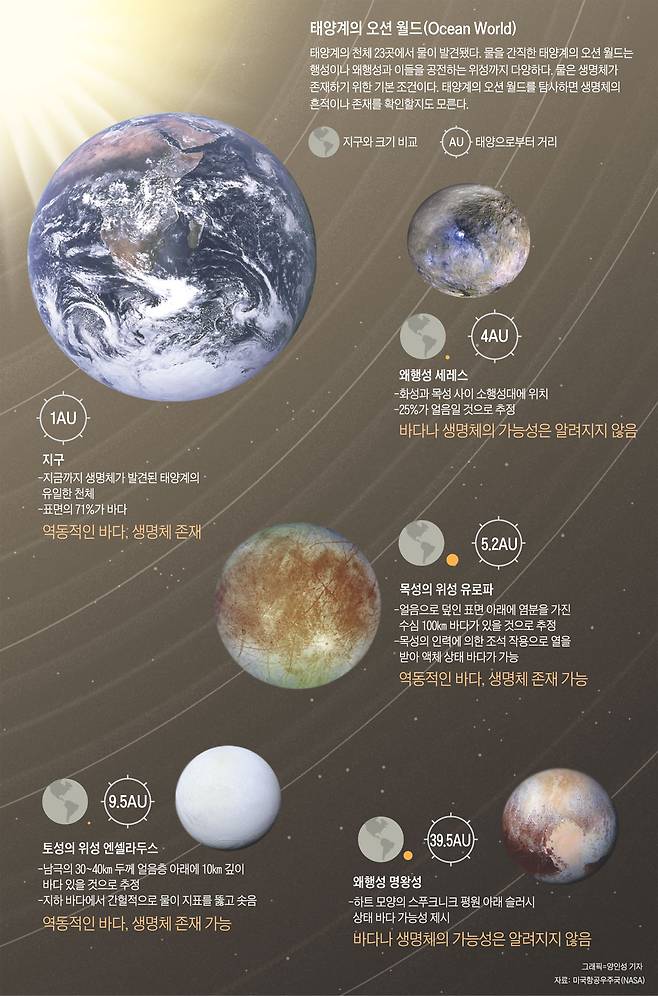 하지만 뭐니뭐니해도 태양계 최고의 오션 월드 후보는 목성의 위성 유로파와 토성의 위성 엔셀라두스다. 다른 곳에서처럼 슬러시나 얼음 상태의 물이 아니라 생명체가 탄생하기에 충분한 온도의 바다가 있을 것으로 추정되기 때문이다.