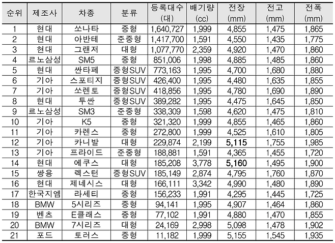 중·대형 차량 비율뿐만 아니라 차량 크기도 커졌다. 일례로 중형 세단 쏘나타의 제원 변화를 살펴보면 신차 출시(’85) 대비 전장은 27.7cm, 전고는 9.5cm, 전폭은 11.0cm 늘어났다.