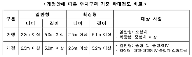 이번 개정안에 따르면 주차단위구획 최소 기준을 일반형은 기존 2.3m(전폭)×5.0m(전장)에서 2.5m(전폭)×5.0m(전장)로, 확장형은 기존 2.5m(전폭)×5.1m(전장)에서 2.6m(전폭)×5.2m(전장)로 확대한다.