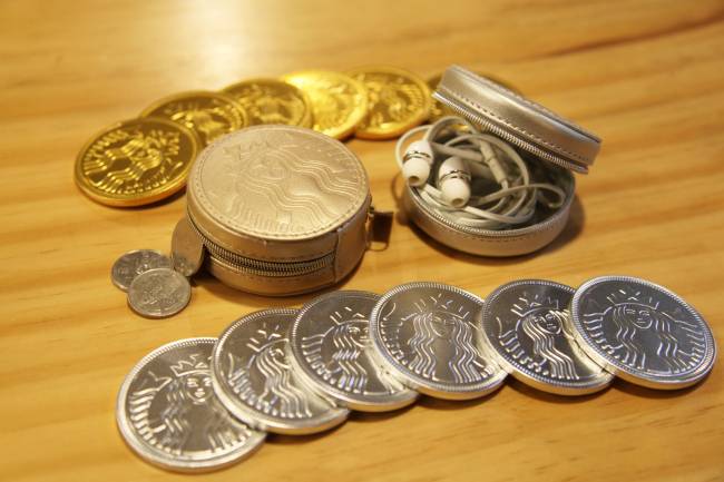 1월 1일 전국 1000여개 스타벅스 매장에서 선보인 코인 파우치는 스타벅스의 코인초콜릿 6개가 들어 있는 인조가죽으로 된 동그란 파우치로 동전지갑이나 이어폰 케이스 등 다용도로 활용이 가능하다.