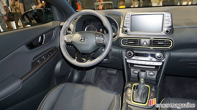 가성비를 노리는 스마트 소비자들을 겨냥한 코나는 편의사양 역시 스마트폰 세대와 잘 어울리는 것들로 꾸몄다. 우선 안드로이트 오토와 애플 카플레이 옵션은 물론 무선충전장치도 기본 탑재하고 있다. 센터페이시아의 컬러 역시 시안성이 뛰어나고 중앙의 LCD 버튼 역시 직관적이며 개성있게 디자인 되어 있었다. 특히 수평형 레이아웃은 낮게 넓게 배열되어 개방감과 쾌적감을 끌어올리고 있다. 이 배열은 AVN 모니터를 계기판과 같은 높이에 배치했다는 점이 주요했다.