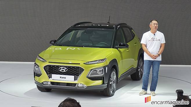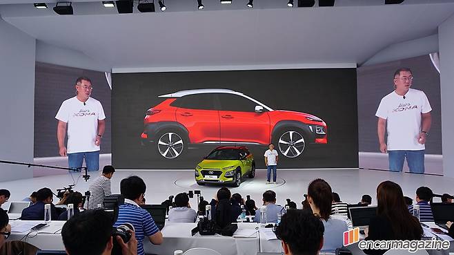 현대차가 자사의 소형 SUV 코나를 세계 최초로 선보였다. 현대차는 기존 B세그먼트 SUV 시장에 늦게 데뷔한 만큼 이 시장에 존재감을 확고히 할 3가지 무기를 탑재했다고 밝혔다. 정의선 부회장을 앞세운 이번 코나의 데뷔무대는 그 어느 때 보다 뜨거운 무대였다. 200여 명의 외신 기자를 비롯해 모두 400여 명의 내외신 기자들의 취재 열기가 더해졌다.