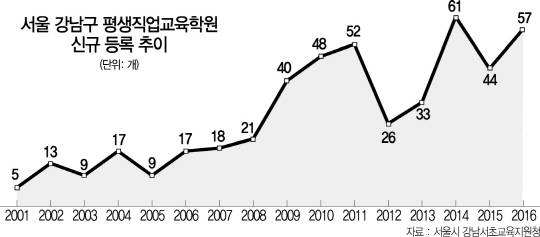 이러한 불안 심리에 편승해 인생 이모작을 준비할 수 있는 직업교육학원도 늘고 있다. 2013~2015년 서울 강남·서초구에 신규 등록된 평생직업교육학원 수가 241개로 직전 3년간의 182개를 크게 웃돈 것도 이 때문이다. 최근에는 인터넷쇼핑몰 창업, 정보보안, 게임 그래픽, 카지노 딜러처럼 예전에는 찾기 어려웠던 새로운 ‘먹을거리’를 가르치는 학원들이 잇달아 강남에서 문을 열었다.