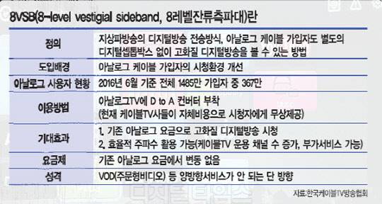 미래창조과학부와 케이블TV 업계가 아날로그 케이블방송 가입자도 디지털 셋톱박스 없이 디지털방송을 볼 수 있는 전송방식인 '8VSB'(8-level vestigial sideband. 8레벨 잔류 측파대) 이용을 적극 유도하고 있습니다. 케이블TV는 디지털 전환으로 경쟁력을 끌어올려야 하지만, 취약계층과 노인층 등 아날로그 케이블방송을 고집하는 가입자가 여전히 남아있기 때문인데요.