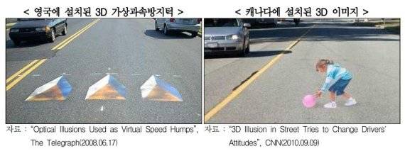 해외에선 트릭아트 기법을 활용한 3D 입체 가상 과속 방지턱이 활용되기도 합니다. 노면이 도출된 것과 같은 효과가 있기 때문에 효과가 더 크다고 합니다.