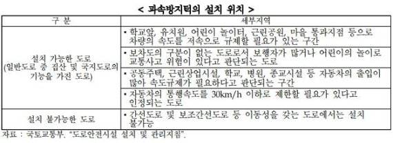 도로안전시설 설치 및 관리지침에 의하면 과속 방지턱은 차량 속도를 시속 30㎞/h 이하로 제한할 필요가 있는 2차선 미만의 좁은 도로, 학교 앞·유치원 등 어린이 보호구역, 주거지역 보행자의 통행안전이 필요하다고 판단되는 도로에 설치하게 됩니다.