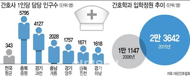 활동 간호사 1명당 담당 인구수의 지역별 편차도 심각하다. 간호협회가 ‘2014 지역별 의료인력현황’을 분석한 자료에 따르면 활동 간호사 1명 당 담당 인구수의 전국 평균은 343명이다. 그러나 충북 증평군의 경우 5795명으로 전국 평균의 17배, 경기 과천시는 4127명으로 12배, 충남 계룡시는 2028명으로 6배에 이르는 것으로 나타났다.