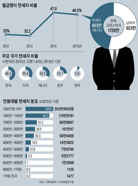 20일 국세청에 따르면, 2015년 기준으로 근로소득자 1726만명 중에서 53.5%인 923만명만 세금을 냈고, 46.5%인 803만명은 한 푼도 내지 않았다. 면세자가 모두 극빈층은 아니다. 연봉 3000만~4000만원 구간에서 면세자 비율이 30.3%에 달하는 등 연봉 3000만원을 넘게 받으면서도 소득세를 안 내는 사람이 88만명에 달한다.