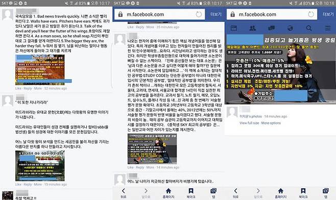 -불법도박을 접하게 된 경로가 무엇인가. “중3 초반에 친구들이 하는 것을 본 적이 있고 인터넷 방송을 통해 접하게 되었다.”“SNS 광고를 통해 알고 친구와 함께 시작했다.““PC방 컴퓨터에서 불법 도박 사이트 홍보를 보고 호기심으로 시작했다.”“친구들이 하는 것을 보고 재밌어 보여서 따라 시작했다.” -주위에 불법 도박을 하는 친구들은 몇 명인가. “8명에서 10명 정도다.”“굉장히 많다.” -불법 도박을 통해 얻고 잃은 금액은 얼마인가. “100만 원 정도를 사용하고 30만~40만 원 정도의 이익을 보았다.”“500만 원 이상 얻었는데 그 중 200만~300만 원은 불법 도박에 다시 썼다. 내 친구 중 한 명은 1000만 원을 땄지만 금방 잃고 다른 사람에게 돈을 빌리면서까지 불법 도박을 해서 결국은 손해를 봤다.”“130만 원의 이익과 60만 원 정도의 손해를 봤다.” -금전적 손실 외에 어떤 영향을 받았나. “부정적인 영향이 있다. 주변 사람들에게 돈을 빌려 필요할 때 돈을 사용하지 못해 빚이 쌓인 적이 있었다.” -불법 도박을 하는 이유는 무엇인가. “처음 호기심에 시작을 한 후 돈을 잃었을 때 잃은 돈을 채워야 한다는 생각과 얻었을 때 더 벌어야겠다는 욕심이 생기기 때문이다.”“한번 시작하면 끊기 어렵기 때문이다.” -불법 도박이 자신의 인생에 미친 영향이 있다면. “100만 원 단위의 돈이 작아 보이는 인식이 생겼고 돈을 함부로 사용하게 되었다. 또 여가시간을 불법 도박을 하며 보내므로 학업에 영향을 미쳤다.” -불법 도박을 하다 누군가에게 들킨 적이 있는가. “형에게 걸려 형이 큰 충격을 받은 적이 있다.” -향후에도 불법 도박을 할 생각이 있거나 혹은 친구들에게 추천하고 싶은가. “돈의 가치에 대한 인식이 부정적으로 변하기 때문에 추천하고 싶지 않다.”“다시는 할 생각이 없다.”“절대 추천은 하지 않지만 끊을 수가 없다.” 이처럼 청소년들의 불법 도박 실태는 생각보다 심각했다. 그렇다면 청소년들은 불법 도박 사이트에 어떻게 접근할 수 있었을까. 인터뷰에 응한 학생들은 아프리카TV, 소셜미디어(SNS), 음란물 웹사이트, 친구 등을 주요 경로로 지적했다. 특히 SNS를 통해 불법 도박을 접한 경우가 많았는데, 유명 페이스북 페이지와 구독자가 많은 SNS 채널의 댓글란에서 처음 알게 됐다는 대답이 가장 많았다. SNS를 이용하는 시간이 긴 청소년들이 불법 도박에 쉽게 노출되는 환경인 것이다.
