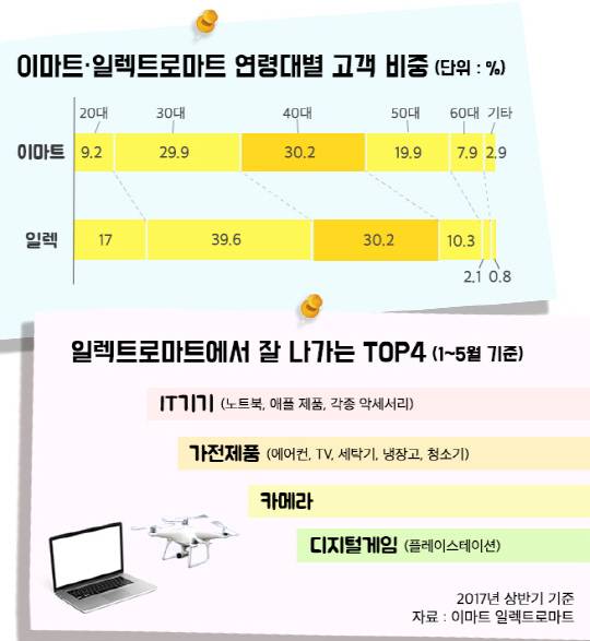 [서울경제] 최근 쇼핑, 취미, 힐링을 동시에 경험할 수 있는 일명 ‘남성들의 복합 쇼핑 문화 공간’까지 등장했다. ‘남성들을 위한 놀이터’를 표방한 이마트 일렉트로마트다. 이마트 일렉트로마트는 각종 가전기기와 남성 패션·뷰티 상품 코너는 물론이고 남성 이발소, 드론 및 RC카 체험 공간, 수입 수제맥주 Bar 등으로 꾸며져 있으며 전국 11개점까지 오픈했다. 얼마 전에는 중년 남성들의 향수를 자극하는 레트로 오락실까지 마련했다. 오로지 남성들의 취향과 관심사에 맞춰 남성 관련 상품에 대한 트렌드를 경험할 수 있는 복합 문화 공간으로 진화한 것이다. 이마트에 따르면 “일렉트로마트의 40·50대 남성고객 비중은 약 34% 에 달하며 이는 이마트 평균인 27.7%보다 높은 수치”라며 “최근 40·50대 1인 가구 남성 고객이 늘고 있어 1인용 소형 가전이나 취미 용품(디지털 게임, 캠핑용품 등)의 수요도 늘고 있다”고 설명했다. 최근 일렉트로마트에서 소형 블루투스 스피커를 구매한 직장인 민동수(48)씨는 “(일렉트로마트가) 직장과 근접해 있어 점심시간에도 종종 산책 삼아 방문해 신제품 등을 구경하러 온다”면서 “일반 백화점에서 볼 수 없는 브랜드나 마니아를 위한 제품들이 구비돼 있고 직접 시연할 수 있어 즐길거리가 많다”고 말했다.