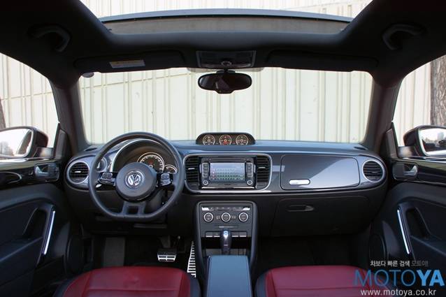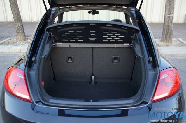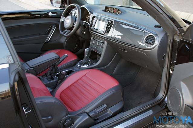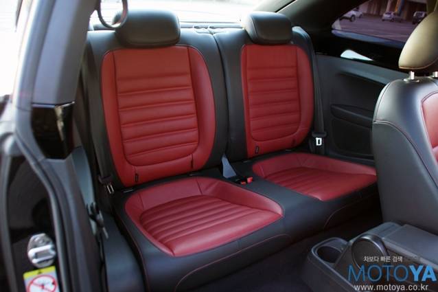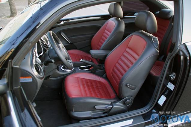 더 비틀의 시트 구성은 2+2 구조로 되어 있다. 레드 컬러로 악센트가 들어간 시트는 시각적으로 만족스러운 부분이다. 앞좌석의 착석감은 단단하지도 무르지도 않은 정도이다. 허리를 탄탄하게 받쳐주는 점이 만족스럽다. 운전석과 조수석 모두 수동 펌핑식 높이 조절기능과 다이얼식 각도 조절 기능이 적용되어 있다. 뒷좌석 공간은 의외로 배려가 잘 되어 있는 편이다. 시트의 형상 자체도 안쪽으로 푹 꺼진 형상인데다 공간에 어느 정도 여유가 있는 편이라 175cm 이내의 성인이라면 큰 부담 없이 승차할 수 있다.