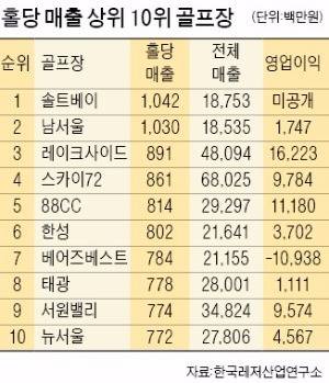 12일 한국레저산업연구소(소장 서천범)가 공개한 ‘2016년 주요 골프장 매출 현황’에 따르면 솔트베이GC는 지난해 홀당 10억4200만원의 매출을 올렸다. 총매출 상위 30개 골프장 가운데 1위다. 홀당 매출은 전체 매출을 홀수로 나눈 것으로, 알짜 영업의 척도로 알려져 있다.