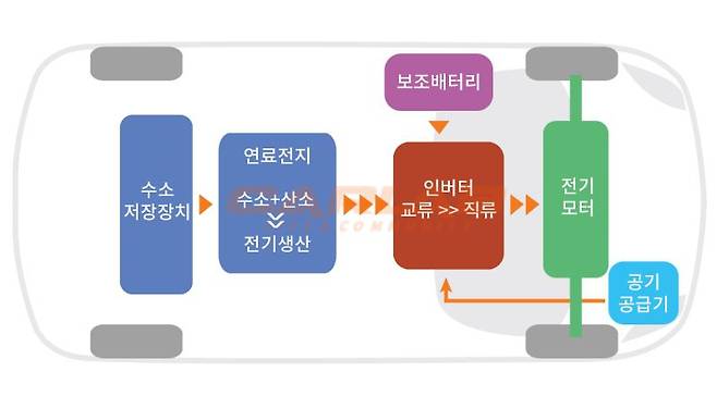 연료전지차는 어떤 구조일까요? 당연히 '엔진'은 없습니다. 기본적으로 수소탱크, 연료전지, 보조배터리, 직류를 교류로 바꿔주는 인버터, 공기공급기로 구성됩니다. 자 그럼 단계별로 구동 원리를 살펴보겠습니다.