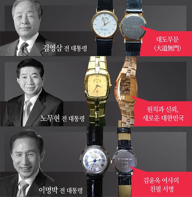 전두환 전 대통령은 1982년 아시아 선수권대회에서 종합 우승한 복싱 선수단에 대통령 손목시계를 선물했습니다. 박근혜 전 대통령은 취임 첫해 광복절을 맞아 국가유공자들에게 기념 시계를 선물했습니다.