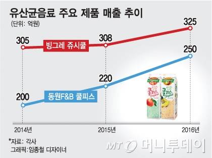 원조는 쿨피스지만, 현재 매출 1위는 빙그레 '쥬시쿨'로, 두 제품이 시장을 양분하고 있다. 쥬시쿨 매출액은 2014년 305억원에서 2015년 308억원, 지난해 325억원으로 성장했다. 올 들어서도(1~4월) 전년 대비 6% 신장했다. 쥬시쿨은 최근 뜨는 프랜차이즈 '신전떡볶이'에 납품하는 등 B2B(기업간 거래) 매출이 높아 후발주자지만 1위에 올랐다.