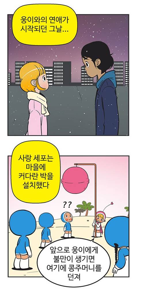 그런데 유미는 얼마 전 구웅에게 “우리 생각할 시간이 좀 필요한 것 같아”라고 말했다. 연애가 시작되던 날, 유미의 사랑 세포는 마음에 커다란 박을 하나 설치했다. 그러고는 세포들에게 “구웅에게 불만이 생기면 여기에 콩주머니를 던져” 하고 말했다. 그래서 이런저런 서운한 일이 있을 때마다 세포들이 몰려가 박을 깨기 위해 콩주머니를 던졌다. 그러나 박은 터지지 않는다. 그러던 어느 날, 좋아하는 츄러스를 사먹기 위해 줄을 선 유미에게 구웅은 “나는 줄 서서 뭐 사먹는 거 보면 이해가 안 되던데” 하고 말한다. “되게 시간 아깝지 않아?” 하고 덧붙이는 구웅에게 유미는 그럼 다른 것을 먹자며 줄에서 이탈한다.