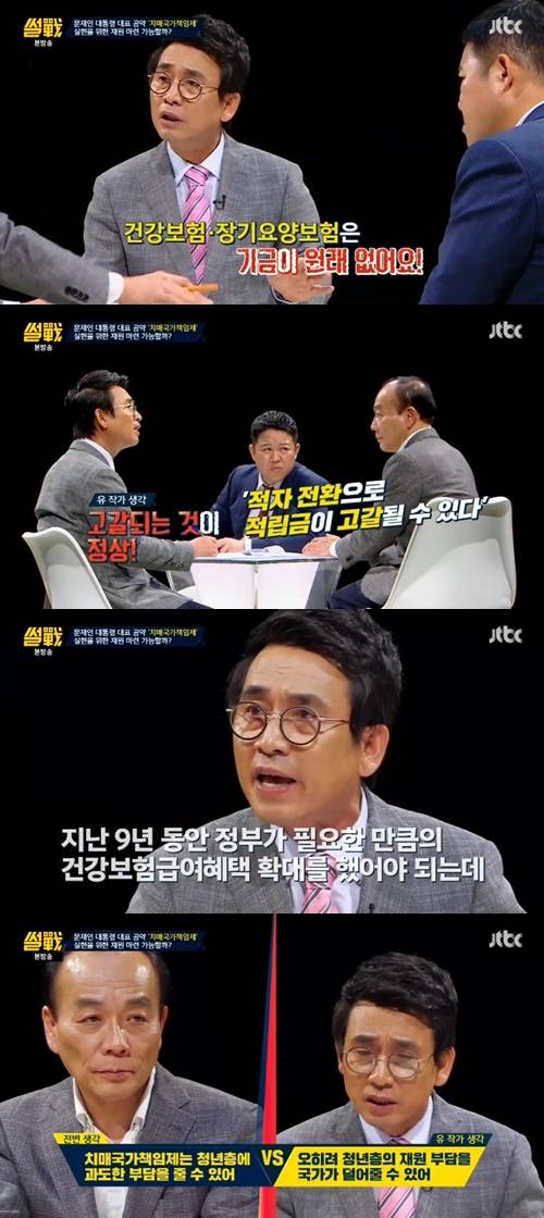 전원책 변호사가 "그렇더라도 정부에서는 장기요양보험에 그동안 축적된 돈을 기금으로 해석한다는거다. 이것도 고갈될 수 있다"고 말했지만 유시민 작가는 "고갈되는게 정상이다. 적립금이 있다는건 과다하게 보험료를 걷었거나 아니면 보험혜택을 적게 줬기 때문에 남은거다"고 반박했다.