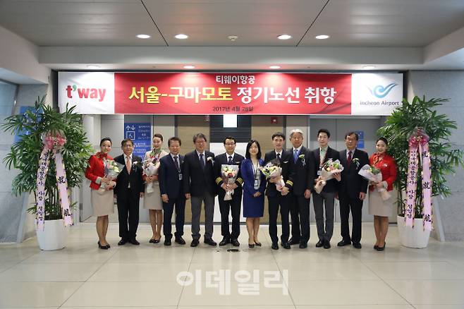 티웨이항공은 인천국제공항 여객터미널에서 최민아 인천공항공사 허브화전략처장, 차형태 동보공항서비스 사장, 정홍근 티웨이항공 대표이사 등 관계자가 참석한 가운데 인천-구마모토 정기 노선의 취항식을 가졌다고 28일 밝혔다.