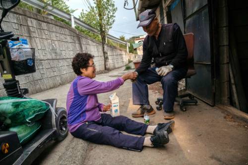 <<사진 = 부인 구광래(77)씨가 대장간 입구에 앉아 장인과 우유를 나눠 마시고 있다. 구씨도 20여년 전 청각장애 5급 판정을 받았다. 보청기가 없으면 둘은 대화가 어렵다.>>