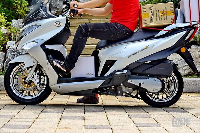 스티져로 실제 퀵서비스나 배달업으로 사용하는 것처럼 짐을 수납해봤다. 2016년형 스티져E는 플로어 패널의 넓이가 이전 버전보다 30mm 증가했다. 때문인지 플로어 패널에 짐을 올리고도 양발을 모두 패널 위에 올려놓을 수 있었다.