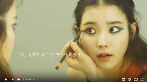 화장품 브랜드 '더샘'의 29초짜리 광고 속 아이유의 메이크업은 파격적이다. 오른쪽 눈엔 주황색, 왼쪽 눈엔 청록색으로 양쪽에 다른 색 아이섀도를 칠하고 있다.