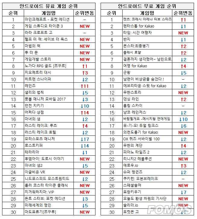 안드로이드 유료 게임 순위에서는 새로운 게임들이 대거 차트에 이름을 올렸다.