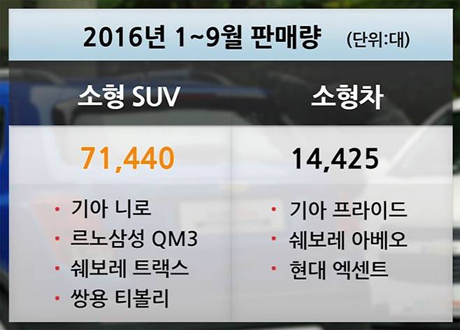 소형차 시장 대부분이 소형 SUV로 편중된 상태이기도 하다. 올해 1월부터 9월까지 국내 소형차 판매량을 비교해보면 소형 SUV가 소형 세단 및 해치백보다 5배가량 많이 팔렸다.