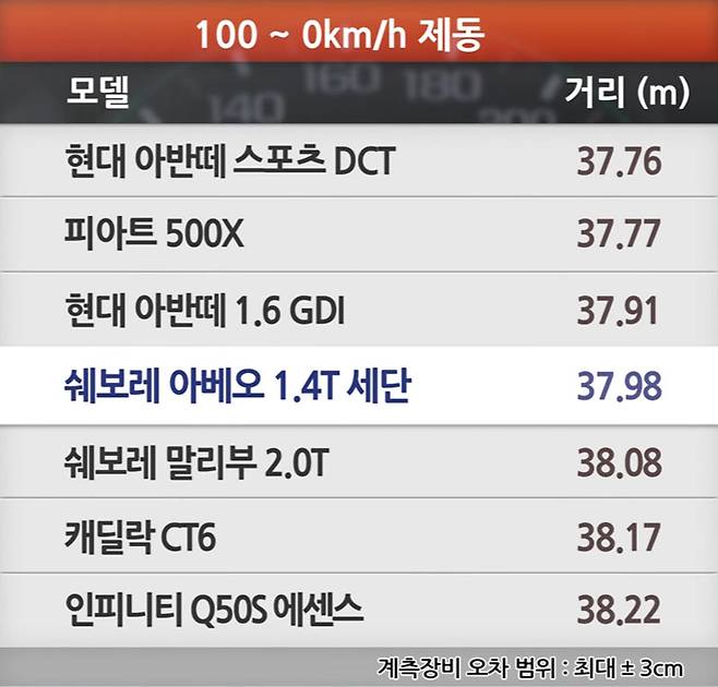 정지 상태에서 시속 100km까지 가속하는데 소요된 시간을 측정했다. 아베오 세단은 9.19초를 기록해 냈다. 우리 팀이 과거 해치백 모델 테스트 당시 8.9초를 기록했으니 대략적으로 8초 후반에서 9초 초반의 가속력을 갖췄다고 이해하면 되겠다. 현재는 단종된 구형 말리부 2.0 디젤이 9.1초, 현대 싼타페 2.0 4WD 모델이 9.2초를 기록했으니 비교가 될 것이다.