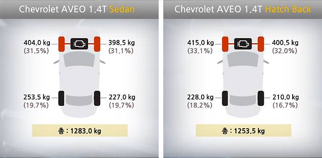트렁크가 추가되면서 해치백보다 무게가 약 30kg 가량 무거워졌다. 하지만 뒷부분에 무게가 실리면서 전후 무게 배분은 세단(62.5:37.5)이 해치백(65:35)보다 좋아졌다. 실측 결과 해치백은 1,253kg, 세단은 1,283kg의 무게를 갖고 있었다.