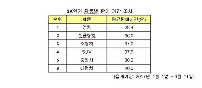 이번 조사는 올해 4월 1일부터 6월 11일까지 SK엔카 홈페이지에서 50대 이상 판매 완료된 매물의 평균 판매 기간을 조사하여 진행했다. 차종별로 분석한 결과 경차가 판매 완료까지 평균 28.4일이 소요되어 가장 빠른 것으로 나타났으며 그 다음으로 준중형차가 36.0일, 소형차가 37.0일이 걸리는 것으로 나타났다.