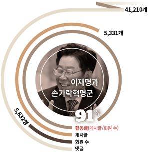 트위터로 연결된 관계망은 이재명을 정점으로 한 조직적 위계가 뚜렷했다. 이 시장의 트윗을 직접 지지자들이 받아 순차적으로 확산시키는 ‘중앙집중형’이다. 김학준 아르스프락시아 여론분석팀장은 “이 시장의 영향력이 압도적으로 높고, 지지자들의 절대적 숫자는 열세지만 온라인 조직력은 훨씬 높다”고 분석했다.