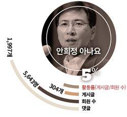 트위터로 연결된 관계망은 이재명을 정점으로 한 조직적 위계가 뚜렷했다. 이 시장의 트윗을 직접 지지자들이 받아 순차적으로 확산시키는 ‘중앙집중형’이다. 김학준 아르스프락시아 여론분석팀장은 “이 시장의 영향력이 압도적으로 높고, 지지자들의 절대적 숫자는 열세지만 온라인 조직력은 훨씬 높다”고 분석했다.