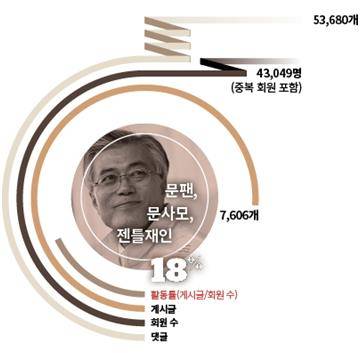 이렇게 보면 문재인 지지자들이 억울해 하는 것도 일리는 있다. 문 전 대표에 대한 공격이 많기 때문에 과격해 보인다는 얘기다. 김 팀장은 “문 전 대표 팬들의 수가 많아 눈에 띌 수밖에 없는 데다, 온라인을 지배하는 파워가 크게 작용한다”고 말했다. 트위터 관계망 분석에서 문 전 대표는 가장 폭넓은 지지를 받는 후보였다. 이 시장과는 대조적으로 ‘부채꼴 확산형’의 문 전 대표 트위터 관계망은 파워 플레이어들이 다수 포진해 가장 빨리 가장 많은 이들에게 확산시키는 게 가능했다. 특히 국회 탄핵소추 가결 후 팬카페 게시글이 2~3배 늘어나는 등 최근 지지활동이 크게 활성화된 것도 ‘문빠’를 수면 위로 불러왔다. ‘문빠’ 현상은 요약하자면 최근 몇 달 새 급부상한 이 시장의 충성 팬들의 집중공격과 1위 수성을 위한 문 전 대표 팬들의 맞대응이 상승작용을 일으킨 결과인 것이다.
