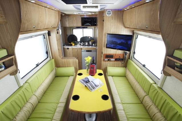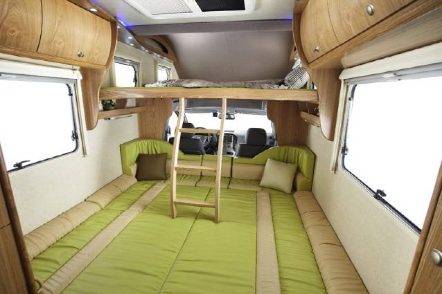 승객실 앞쪽은 소파로 메웠다. 뒤쪽에는 화장실, 주방을 설치했다. 가운데 테이블을 아래로 밀어 숨기고, 그 위에 매트를 깔면 실내 공간 모두를 침대로 쓸 수 있다. 운전석 천장에 위치한 벙커도 매트를 깔아 침대로 쓴다.