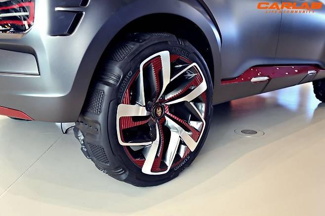 아이언맨 마스크가 새겨진 바람개비 모양 19인치 특수제작 휠도 꽤 멋지다. 더불어 28인치 오프로드용 타이어를 적용해 한층 더 역동적인 외관을 연출했다.