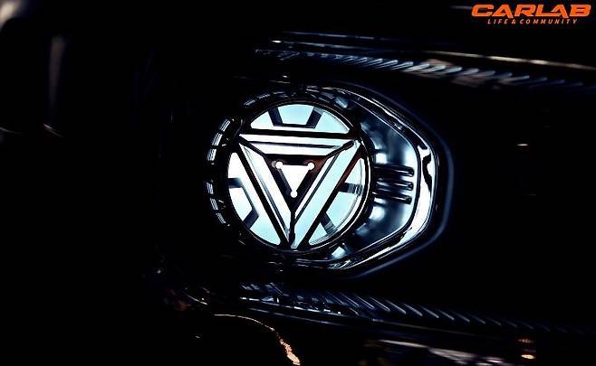 아이언맨 눈매를 닮은 주간주행등에는 쿨화이트 색상 면발광 LED를 적용했으며, 헤드램프에는 아이언맨이 내는 초인적인 힘의 원천! ‘아크 원자로’를 형상화했다. 본넷 위에는 마블 로고도 함께 박았다.