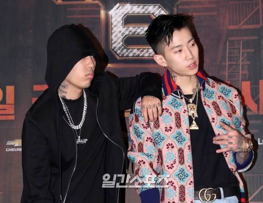 도끼와 박재범이 30일 오전 서울 마포구 aA 디자인 뮤지엄에서 열린 '쇼미더머니6' 제작발표회에 참석하고 있다.