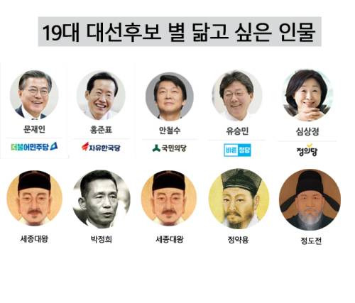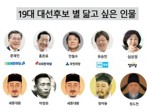 홍준표 자유한국당, 유승민 바른정당, 심상정 정의당 후보는 각각 박정희 전 대통령과 정약용, 조선 초의 정치가 정도전을 각각 닮고 싶은 인물로 선택했다. 홍 후보는 보수표를 얻기 위해, 유 후보는 경제대통령이라는 이미지를 심어주기 위해, 심상정 후보는 개혁적인 성향에 맞춰 각각 닮고 싶은 인물을 선택한 것으로 풀이된다.