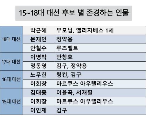 나라의 가장 중요한 일에 지원한 대통령 후보들도 이 질문을 피해갈 수 없다. 지금까지 대선 후보들은 '가장 존경하는 인물'을 통해 자신이 어떤 대통령이 될 것인지 국민에게 어필해왔다.
