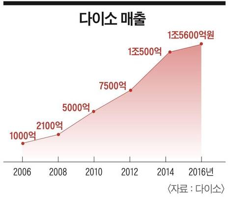 경제 불황에 소비 심리는 위축됐지만 오히려 다이소는 가성비(가격 대비 성능)라는 경쟁력으로 승승장구하고 있다. 2006년 1000억원에 불과하던 매출액은 2014년 1조원을 돌파하며 10배 넘게 성장했다. 연평균 매출 성장률은 20%가 넘는다. 매일 60만명이 전국 다이소 매장을 찾는다. 연간 10억개의 상품이 팔린다.
