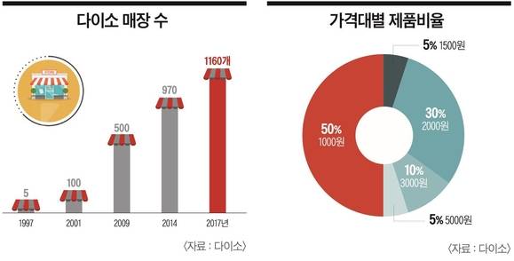 1000원, 2000원, 5000원짜리 등 균일가로 생활용품을 파는 다이소의 매출은 얼마나 될까. 지난해 매출액은 1조5600억원이다. 같은 기간 카카오의 매출액 1조4642억원보다 많다. 상품의 절반 이상이 1000원짜리, 가장 비싼 상품도 5000원이 넘지 않는 상황에서 달성한 성적표다. 지난해 영업이익은 1130억원이 넘는다. 1997년 1호점인 천호점 개장 이래 20년 만에 달성한 기록이다.