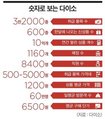 이처럼 값싸고 질 좋은 제품을 다양하게 제공하니 다이소를 찾은 고객은 1회 방문 시 평균 5.5개의 상품을 사간다. 고객 1인당의 평균 매입액를 뜻하는 객단가는 6500원이다. 국내 편의점 객단가(약 5000원)보다 30%나 높은 수치다.