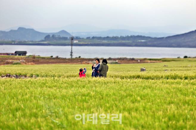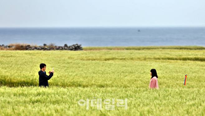 가파도 청보리밭 사잇길을 다정하게 걷고 있는 연인