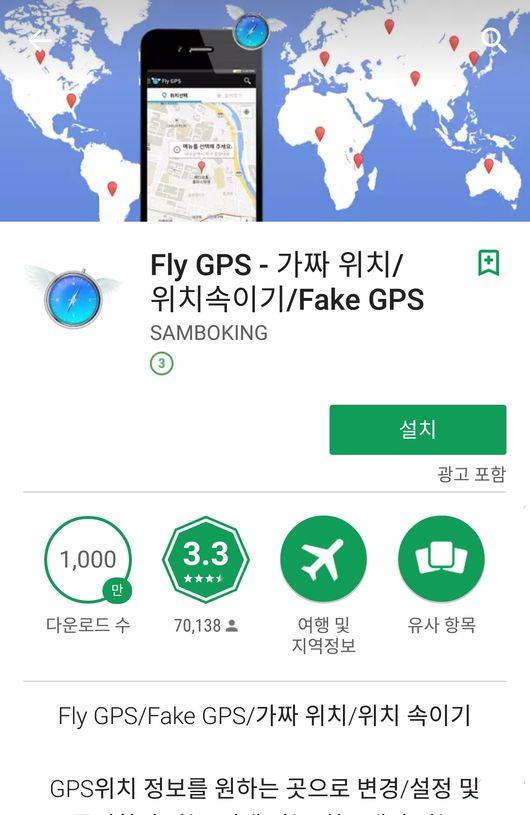 [사진] 어플리케이션 마켓에 올라 있는 GPS 조작 프로그램. 아래 사진은 포켓몬맵.