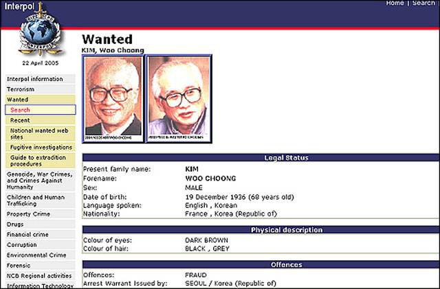 경찰청은 2001년 3월 인터폴에 41조원대 규모의 분식회계(사기) 혐의로 수배된 김우중 전 대우 회장에 대해 인터폴에 적색수배를 요청했으며, 해외 도피 중이던 김 전 회장이 사기 혐의로 적색수배되기도 했다. 5조원대 다단계 사기를 벌인 '희대의 사기꾼' 조희팔도 인터폴에 적색수배가 내려졌었다. 50억 이상의 경제사범인데다가, 조직폭력배로 따진다면 중간보스나 행동대장급 이상에 해당하기 때문이다.