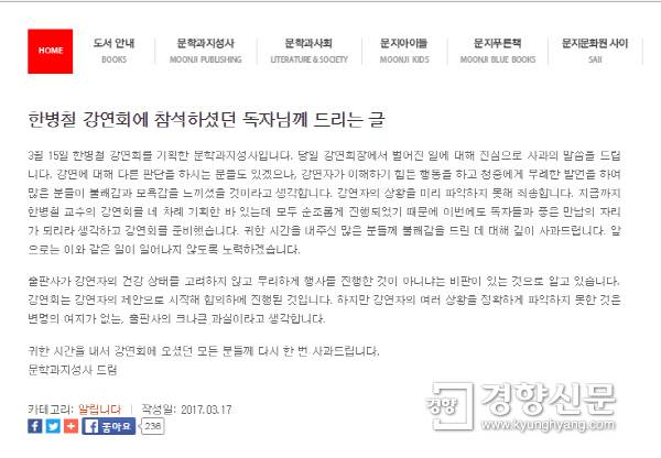 문학과지성사는 지난 17일 공식 사과문을 내고 “강연자의 여러 상황을 정확하게 파악하지 못한 것은 변명의 여지가 없는, 출판사의 크나큰 과실”이라고 밝혔다. 처음부터 한 교수의 건강 문제를 파악했어야 하는 게 아니냐는 부분에 대해서는 “강연회는 강연자의 제안으로 시작해 합의하에 진행된 것”이라고 밝혔다.