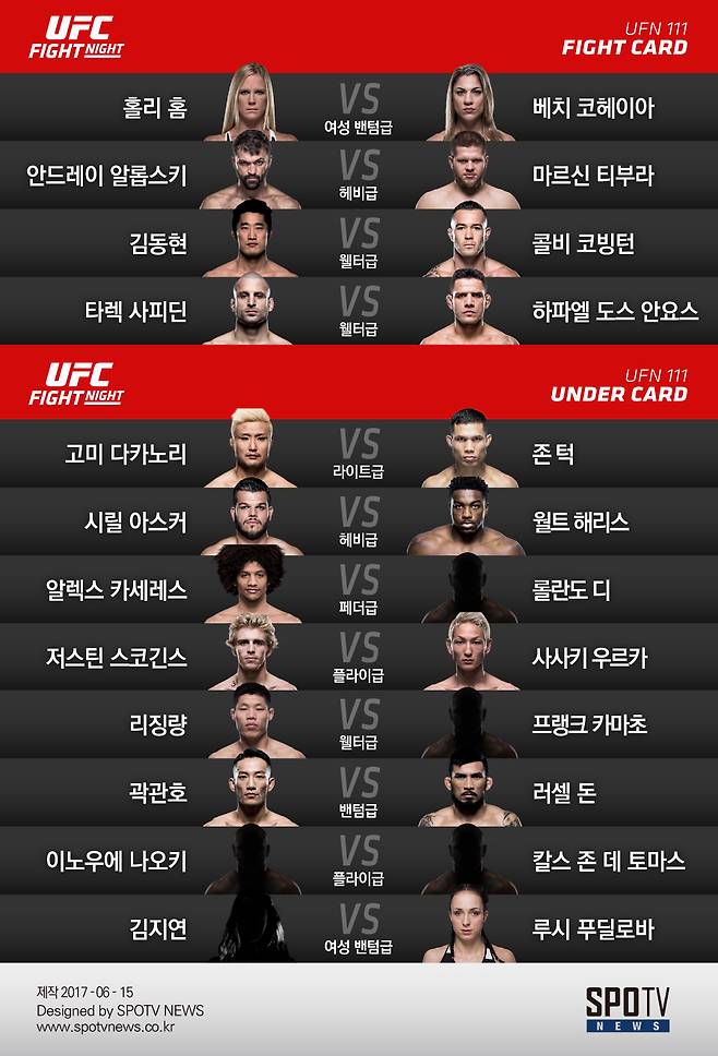 UFC 파이트 나이트 111 언더 카드 경기는 오는 17일 토요일 오후 5시 30분부터 SPOTV ON과 SPOTV+에서 동시 생중계된다. 김동현이 나서는 메인 카드 경기는 밤 9시부터 SPOTV ON에서 독점 생중계된다.